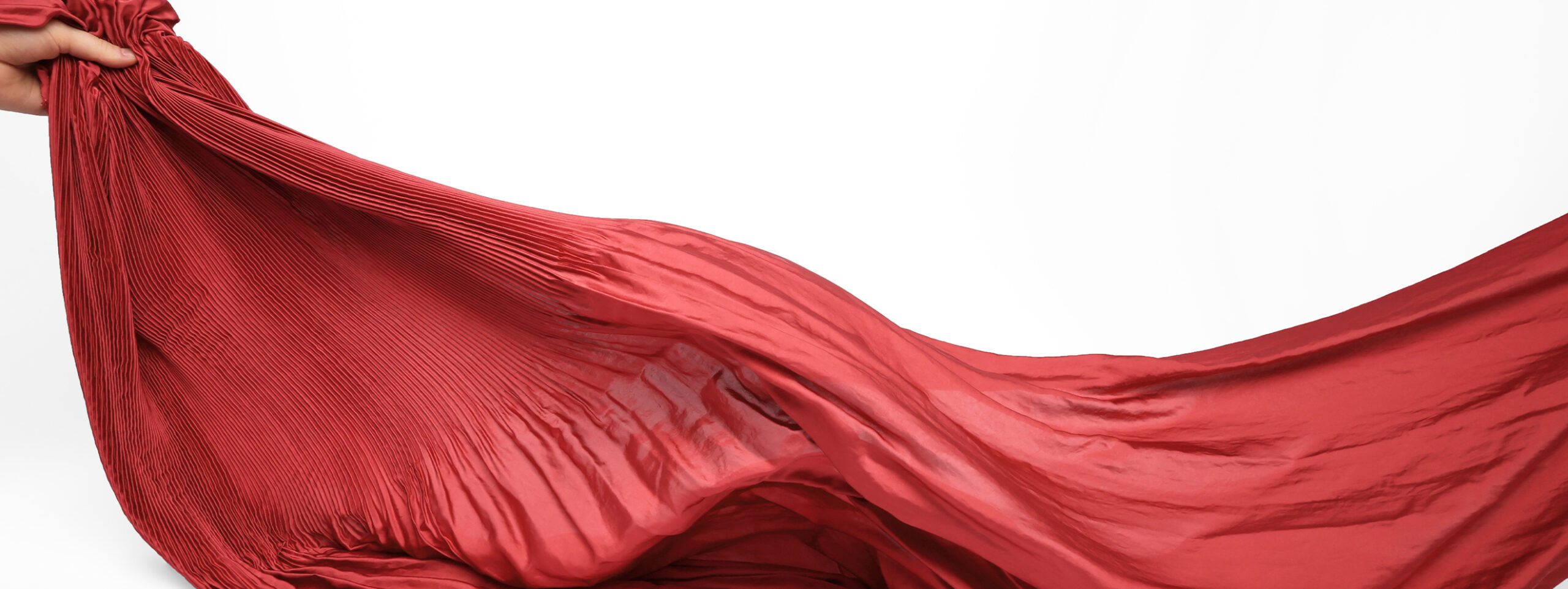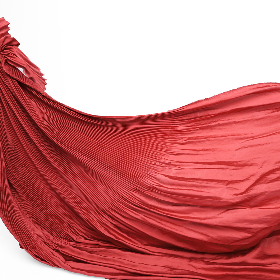 Ce tissu se présente sous forme de panneaux de plus de 150 cm de hauteur, rythmés en trois parties : 12 cm libérés, 40 cm de plissé aux plis fins, serrés et réguliers, puis 100 cm à nouveau libres. Un jeu d’équilibre, de rythme et de contraste qui offre une grande liberté d’usage : l’ensemble peut être utilisé tel quel, ou découpé selon les besoins du modèle.