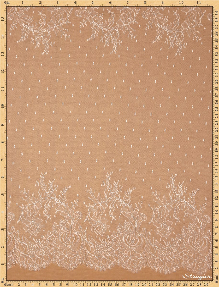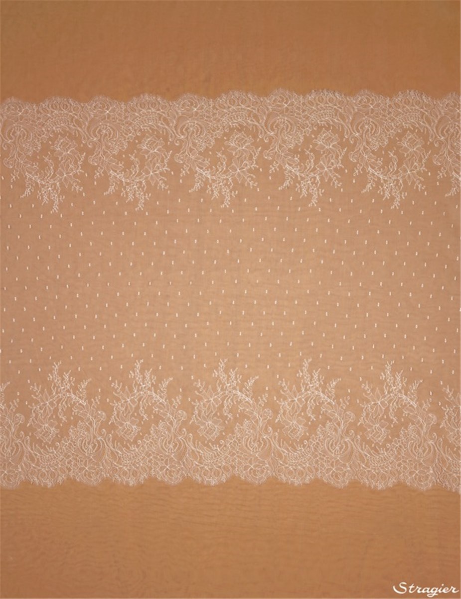 D’une grande finesse et d’une légèreté exceptionnelle, délicate et distinguée, la dentelle Chantilly est la plus belle lorsqu’elle est posée en contraste, soit à même la peau, soit sur un tissu de fond de couleur légèrement différente. Elle peut aussi se révéler d’une grande beauté lorsqu’elle cousue en jupe complète superposée à de fines couches de tulle aérien ou d’organza en soie.
