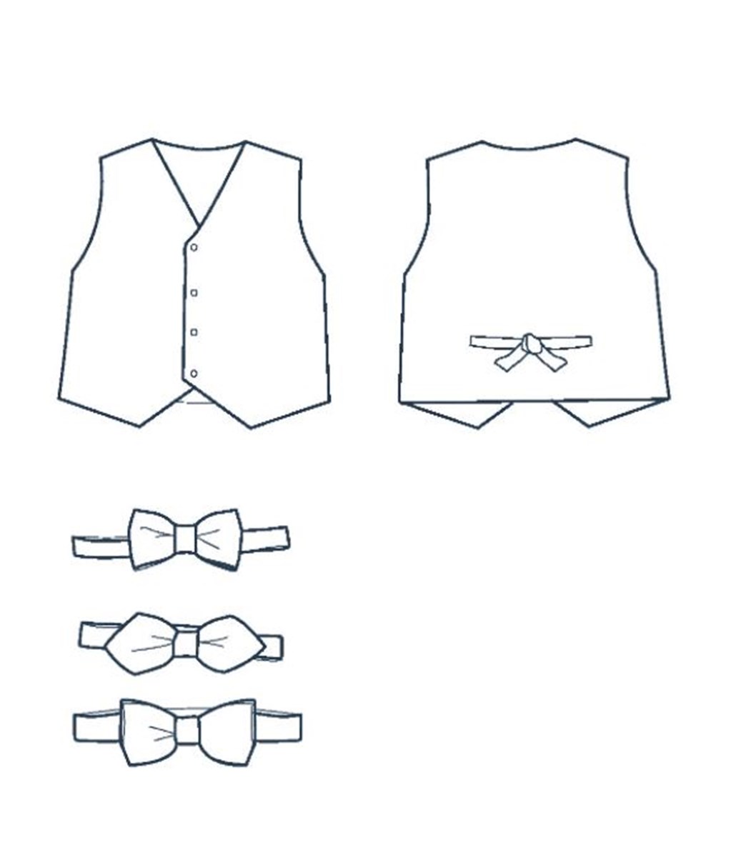 Gilet réversible et nœuds papillon. Le gilet est boutonné devant, avec une bride au dos. Il peut être réversible. Les nœuds sont simples ou doubles.